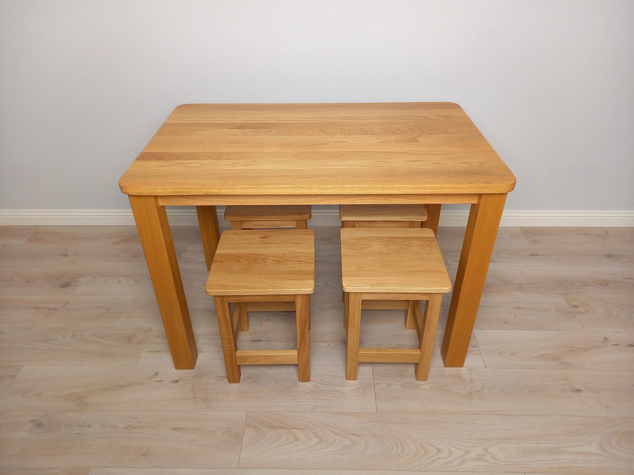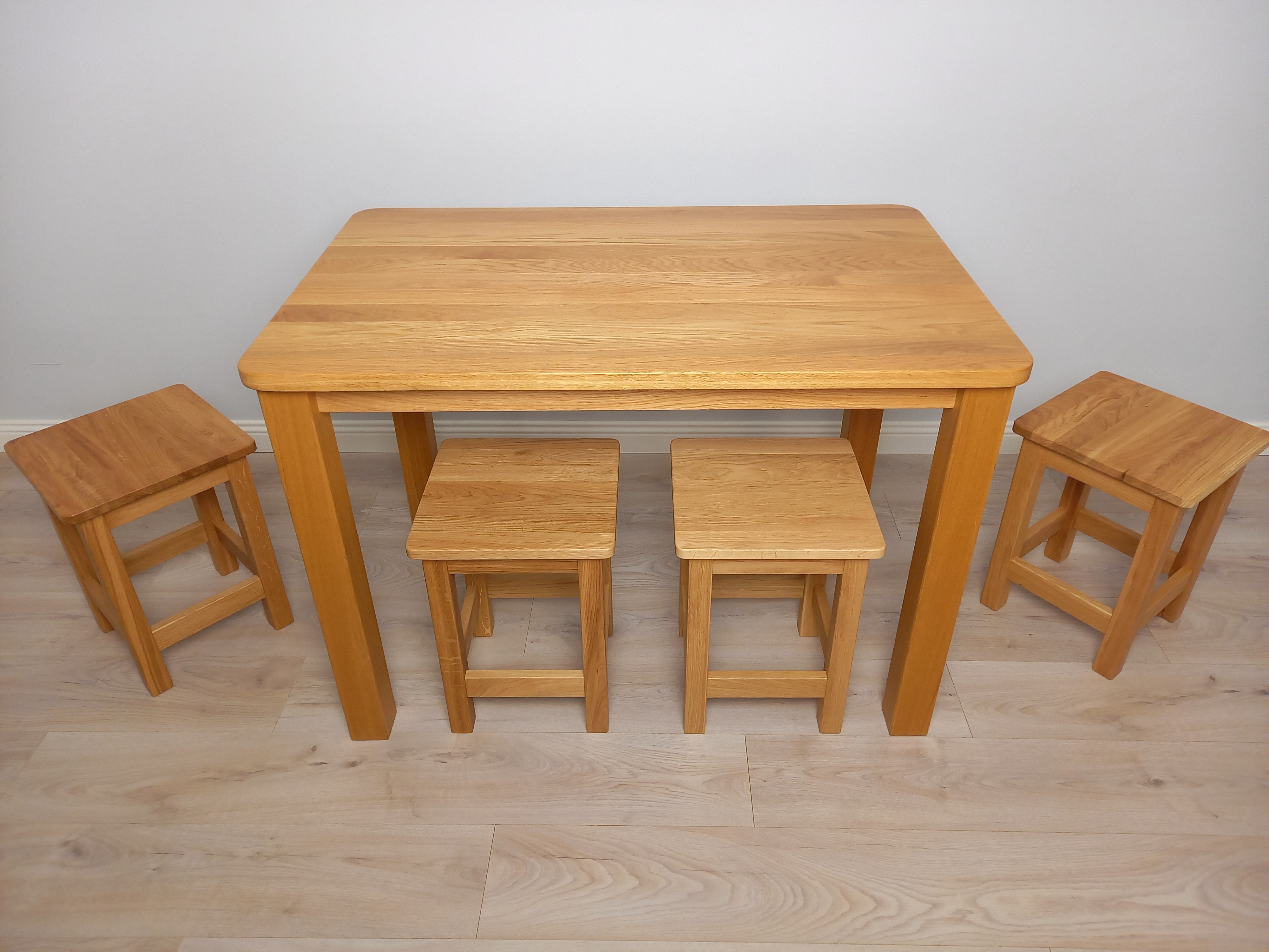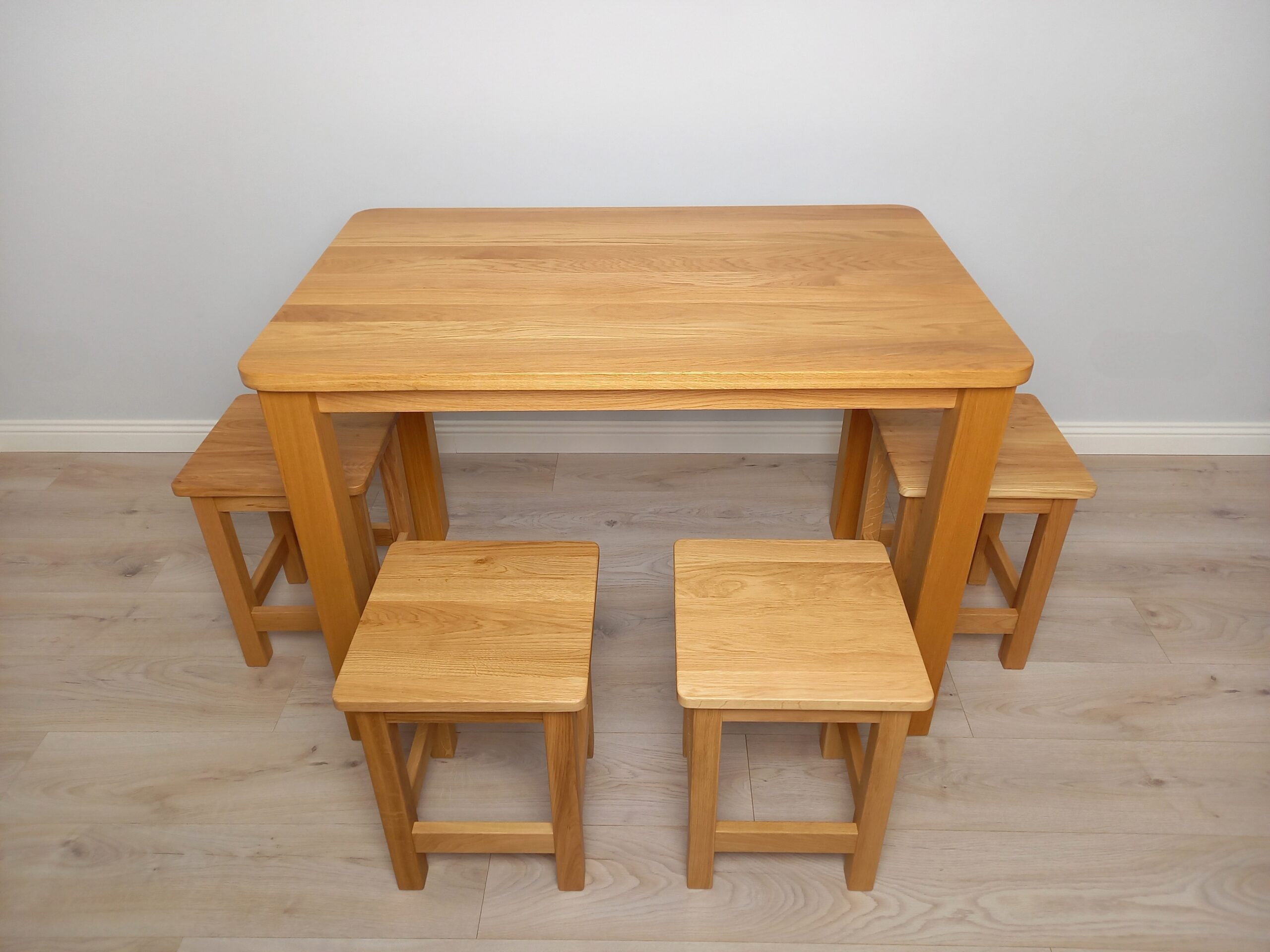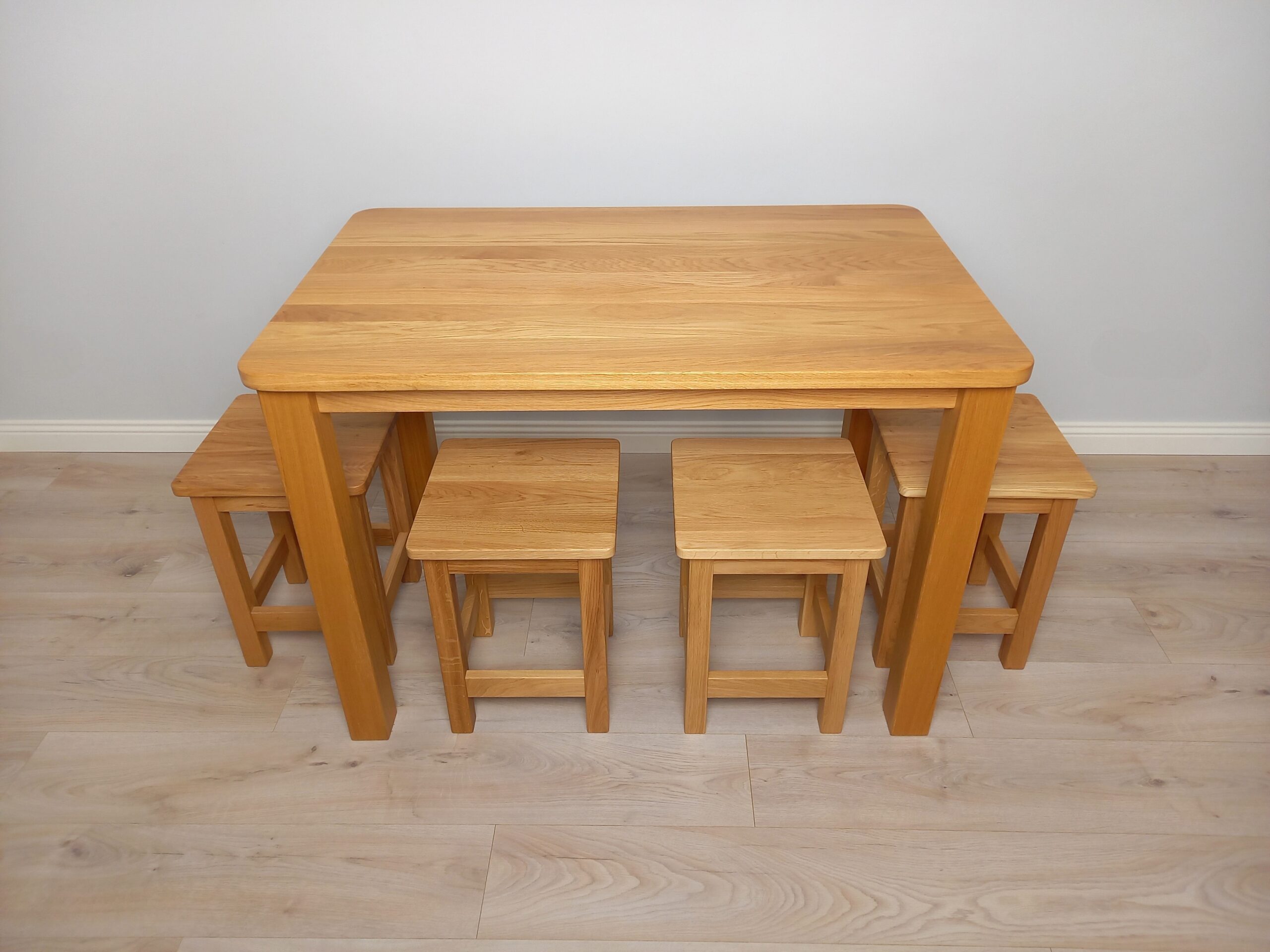 Komplektas „Sengiraitė“ – tai pilnas ąžuolo jaukumo pasaulis vienoje erdvėje. Stalas ir keturios taburetės kuria harmoningą visumą.